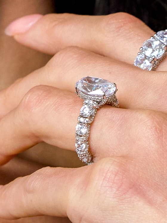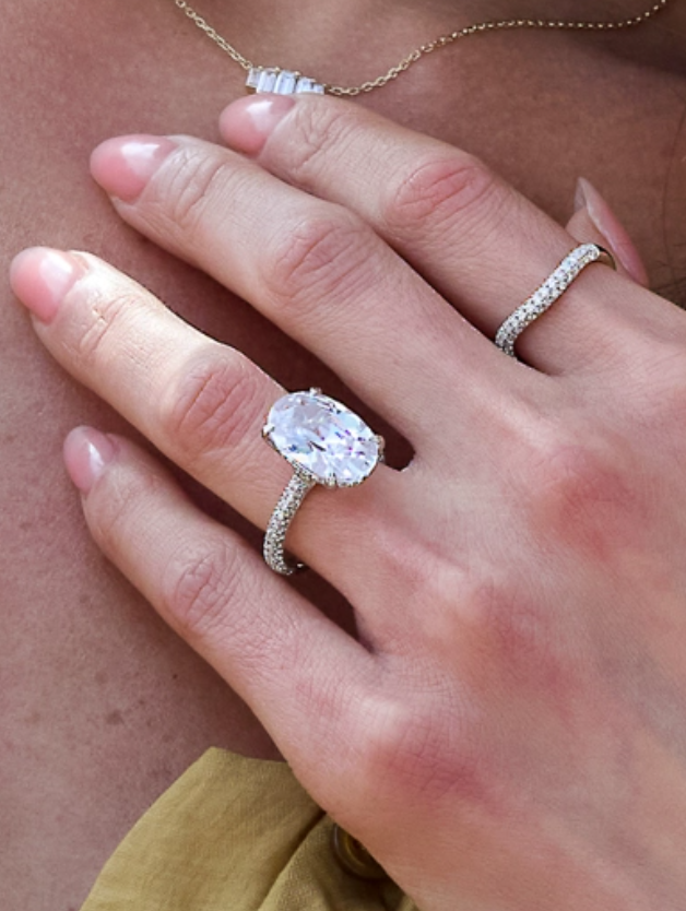 THE BACHELOR STARS Grant and Zoe did a Brides Magazine photoshoot for their date in our 4 Carat Four Prong Studs, 1 1/3 Carat Statement Broad Ring, 11 Carat Three Prong Eternity Necklace, and 2 Carat Three Prong Tennis Bracelet.