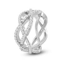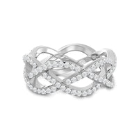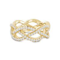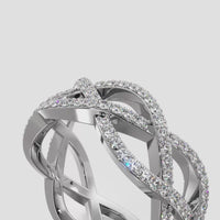 This piece dazzles with its graceful silhouette and boundless sparkle. The ring boasts a loosely woven braid of glistening ribbons with no beginning or end. Each ribbon is traced with prong-set round diamonds.