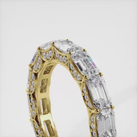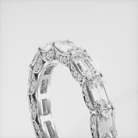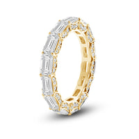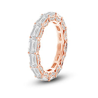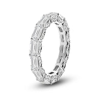 A symbolic and romantic diamond eternity ring designed with a hint of architectural flair. This glittering piece has its entire band set with emerald-cut diamonds held by a sash setting. The sides of the band showcase the undulating silhouette of this unique setting, further enhanced by the presence of accent diamonds.