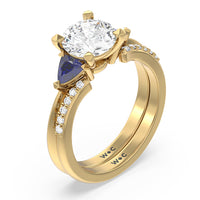 This curved diamond set wedding band is perfectly contoured to complement our something blue knife edge trillion engagement ring for a simple and sophisticated look.