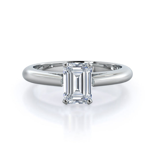 With a minimalist band and an eye-tricking floating cathedral setting, this emerald cut ring proves that less can be so much more. The white gold band adds character without drawing attention away from the stunning solitaire, which is gently hugged by a four-prong setting.
