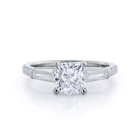Sometimes, it’s all about the sparkle factor. The 18k white gold band is sure to make your center stone and accent stones pop, while the baguette stones act as leading lines toward the gorgeous cushion cut center diamond.