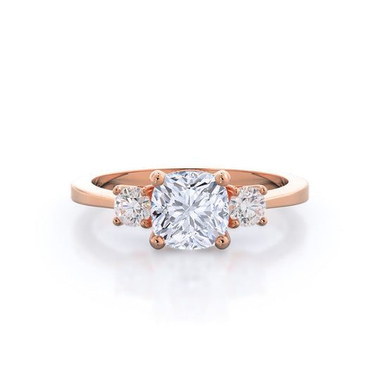 A twist on the classic cushion cut diamond ring. The 18k rose gold band will lightly tint your diamond without taking away from any of its brilliance and offers a change of pace that will look great today—and every day.