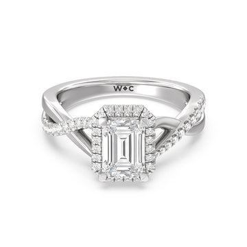 Designed with a twirl-inducing aesthetic, this diamond engagement ring captures the magic in your unique love story. The band has a cross-over split profile where one bypassing ribbon is traced with round diamonds. The arching split shoulders lead to a dominant diamond center stone accentuated by a halo of round pave diamonds.