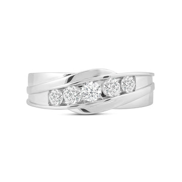 For a bigger statement, the 3 Row Channel Set Diamond Accent Mens' Ring is much thicker than the previous ring. TThis ring's clean-cut profile and geometric simplicity will suit your man's tough but tender masculinity. This ring features a wide and angular band decorated with three slanting channels of round diamonds. The ring narrows toward the back for a comfortable fit.