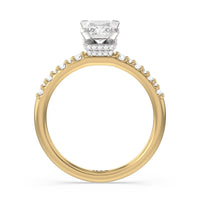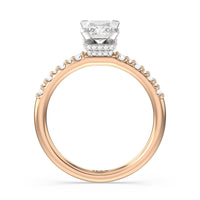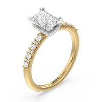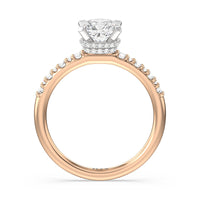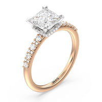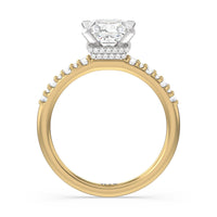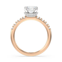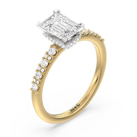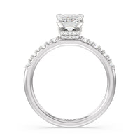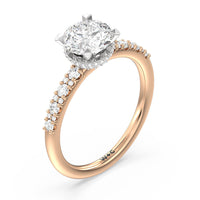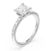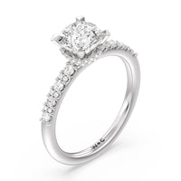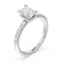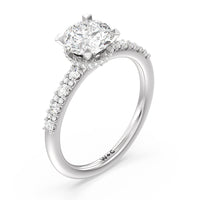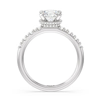 This modern engagement ring features a diamond set band and double row hidden halo making the ring glisten from every angle.