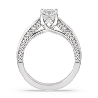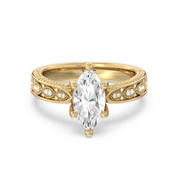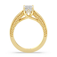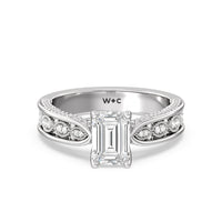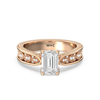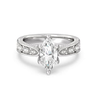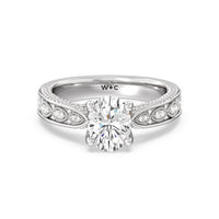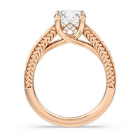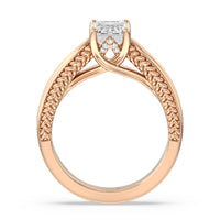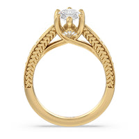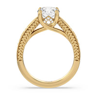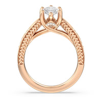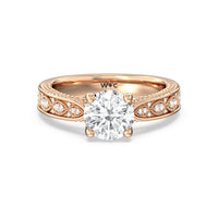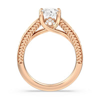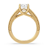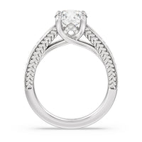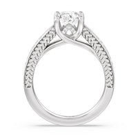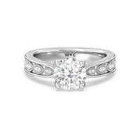 The flowing lines and arrow-shaped detailing of this vintage-inspired engagement ring ensure your choice of diamond is center stage. The classic setting has a unique twist, with the four prongs crossing over in front of a hidden halo accent that points upwards, with diamond pave catching the light. The delicate pave-set shank, milgrain detail, and the filigree chevron pattern on the front view further accentuate the sparkling central diamond.