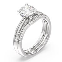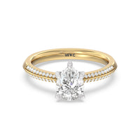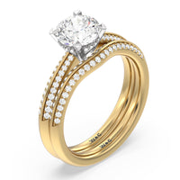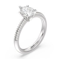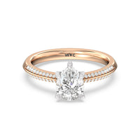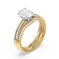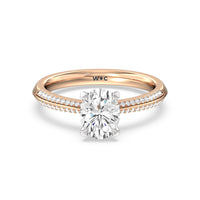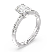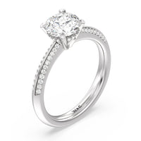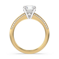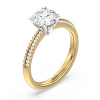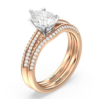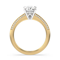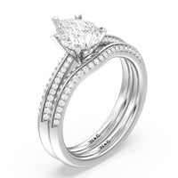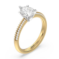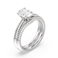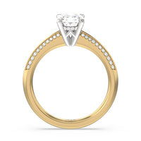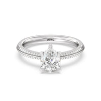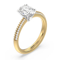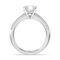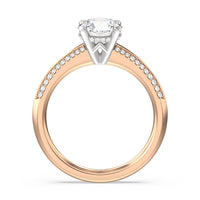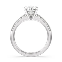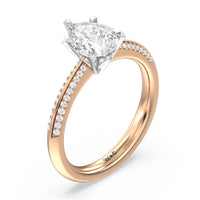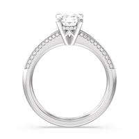 This modern and elegant tapered ring features a double row of pave diamonds which come together in a soft knife edge. The hidden halo swirls around the central stone to create a beautiful celebration of your love.
