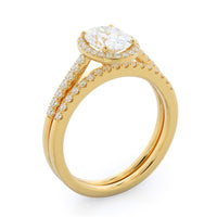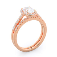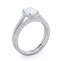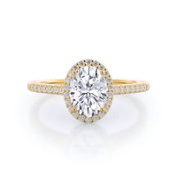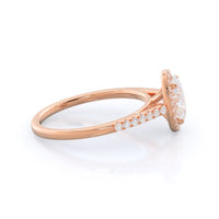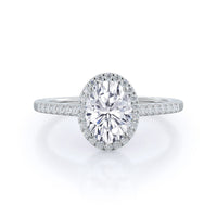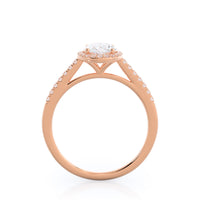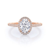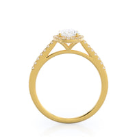 A raised diamond halo encircles with center diamond over a cathedral band that creates additional sparkle