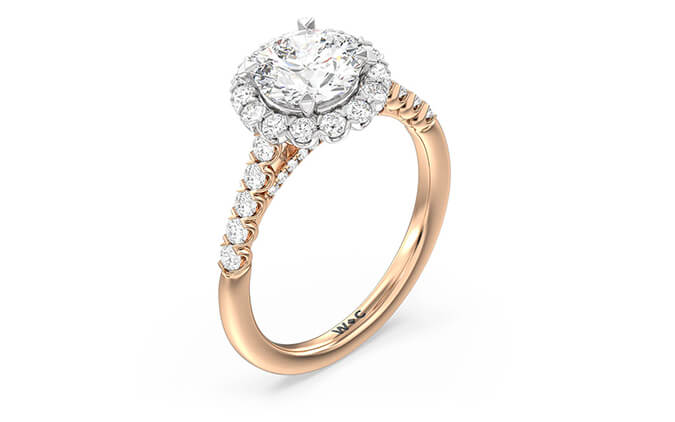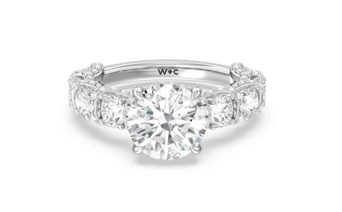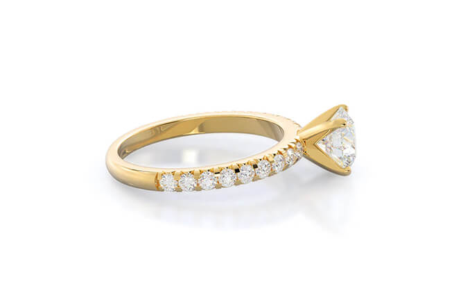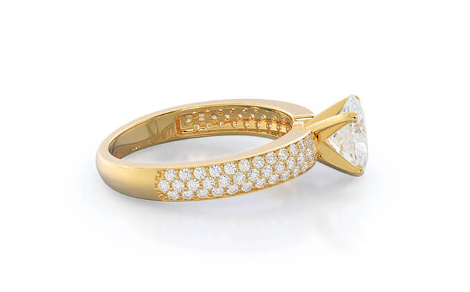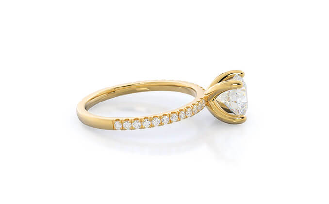 Micro-pavé engagement ring setting is a type of pavé setting that involves using diamonds that often weigh less than 0.01 carats, with tiny prongs to set in jewelry pieces meticulously. These tiny gems, known as melee diamonds, create a captivating appearance when placed closely together. Jewelers drill minuscule holes in the metal band, securing the diamonds with delicate metal prongs or beads, resulting in a smooth, paved look. Due to its intricacy, micro pavé work is typically crafted by hand using microscopes for precision.
