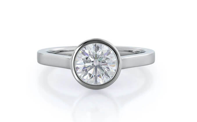 The bezel setting style envelops the outer perimeter of the diamond in a delicate metal enclosure. In a complete bezel set engagement ring, the central gem is placed flush within a slender metal rim, ensuring a secure and snug placement as the metal entirely encircles the stone. Conversely, in a partial bezel setting, the center diamond receives partial coverage on its sides from the metal, allowing for a greater portion of the stone to remain exposed, adding to its visibility and aesthetic appeal.