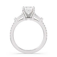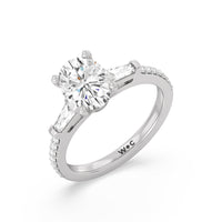 Diamonds feature a three-stone style with classic tapered baguettes and round paved stones