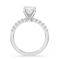 Under bezel shared prong accent diamonds float on the side of your center stone