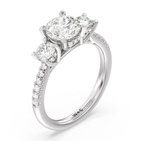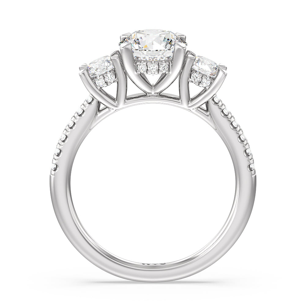 A three-stone token of love that's bursting with sparkle from every angle. This fine piece features a trio of twinkling diamonds in a cathedral setting. The shining centerpiece is flanked by shimmering side stones. A trio of hidden halos completes the glamorous glitter of this ring.