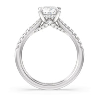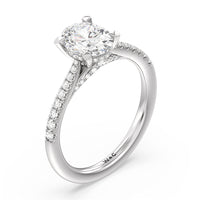 The clean, sweeping lines of this diamond studded gallery along with our signature prongs make this hidden halo ring an show stopper. A slim tapered pave diamond band finish off this elegant ring.