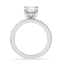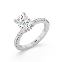 Featuring a sophisticated and delicate shank decorated with pave set diamonds and a hidden halo to accentuate the center stone. Set in gold