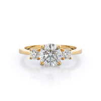 A classic three stone style perfectly accentuated the center diamond. With a petite band, the style is perfect for a center diamond of any size.