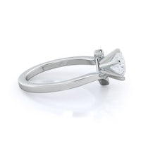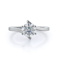 With a smooth band curving all around, the ends of this band finish in a dramatic upwards curve for a striking yet minimal look. A unique solitaire ring that makes a statement.