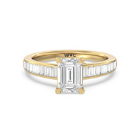 Designed with a dose of glamour, this diamond engagement ring charms with its non-stop sparkle. Its glittering center stone is held by four prongs and accented by baguette-cut diamonds in a channel setting. A graceful band with a strand that curves up to form the prong holding the center diamond adds allure to this piece.