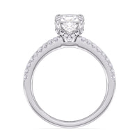 A beautiful and classic ring with an extra sweet surprise. This engagement ring features a stand-out diamond held by four prongs. The setting base where the prongs are attached is cradled by a v-shaped chevron basket encrusted with round diamonds. For extra sparkle and added texture, the shank features diamond side stones in a modern v-cut pavé setting.