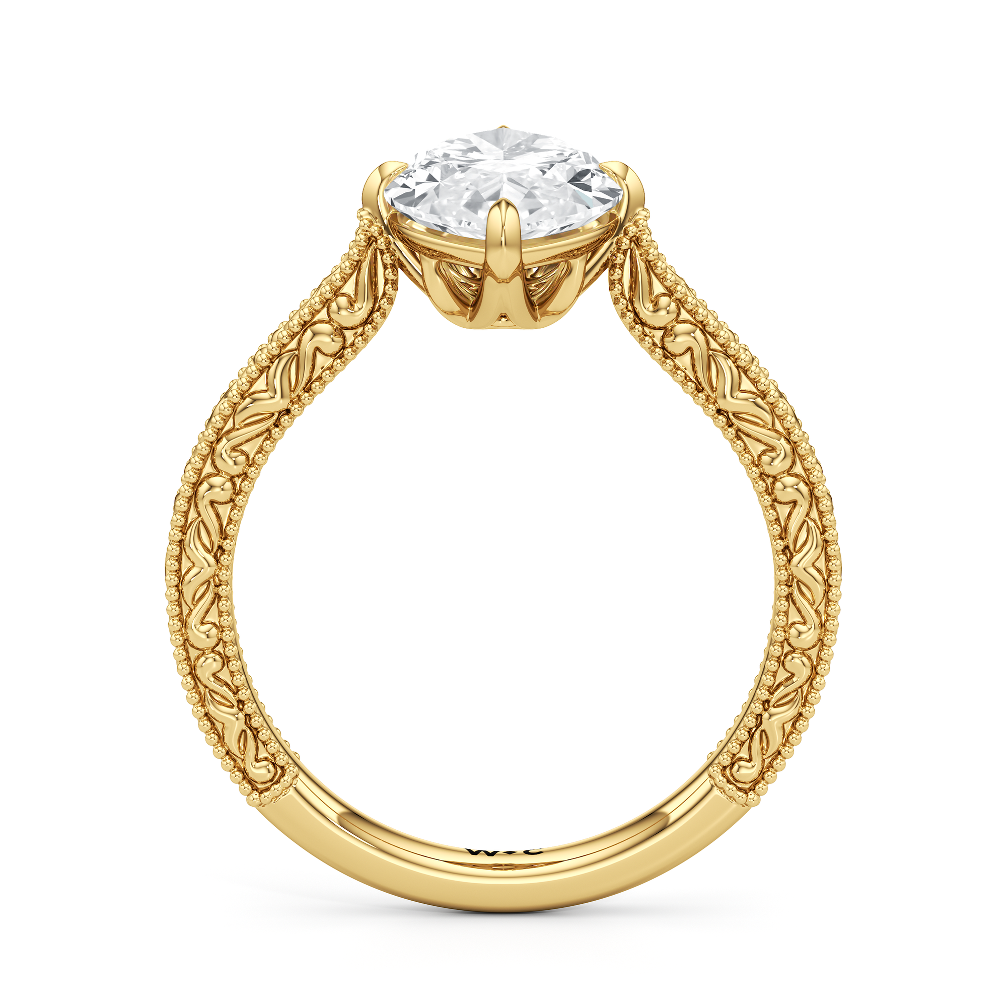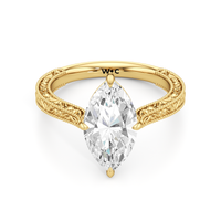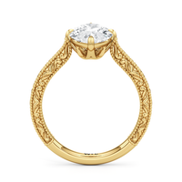 A reverie of vintage elegance, Elodie evokes a memory in lace and light. Its center stone is secured in a striking compass setting atop a sculptural star-shaped basket. The low-profile centerpiece is supported by a tapered shank, adorned with delicate engraving inspired by Art Deco grace.