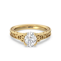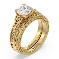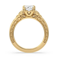 Fall in love with this vintage-style engagement ring, where intricate celtic knots, delicate engraving, and leaf and filigree detailing on the shank create a stunningly detailed band. The heart in the basket design adds a romantic touch, seamlessly flowing into the scroll detailing in the gallery. A dazzling four-prong-set center stone completes this beautiful knot engagement ring, making it a timeless choice.