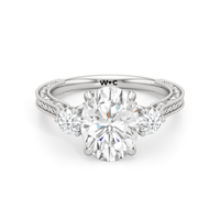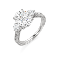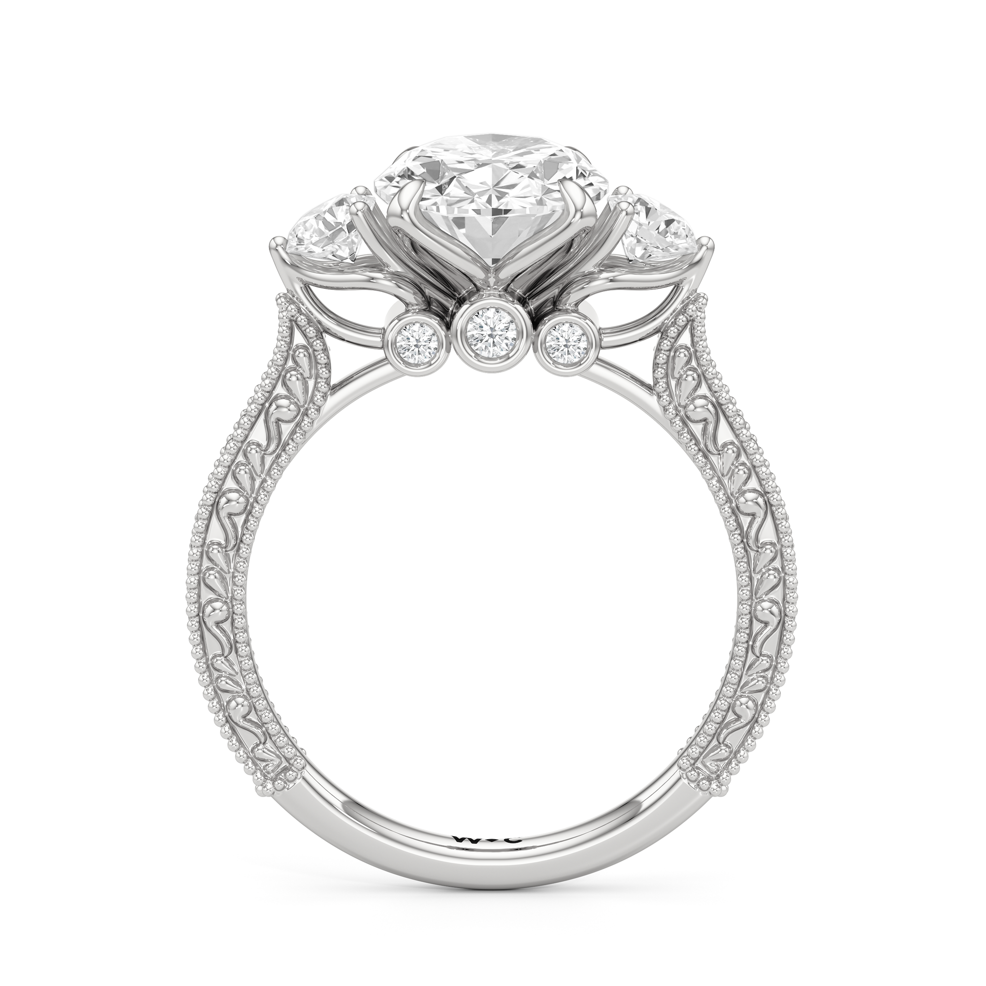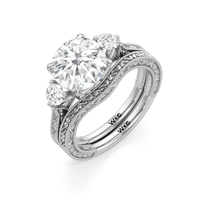 Marcelline carries elegance with quiet command. Its cathedral shoulders rise to meet a vintage-inspired three-stone centerpiece, with each diamond set in a sculpted tulip basket. Three bezel-set peekaboo diamonds add nuance, while fine engraving along the shank offers old-world refinement.