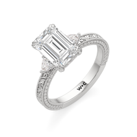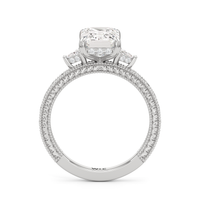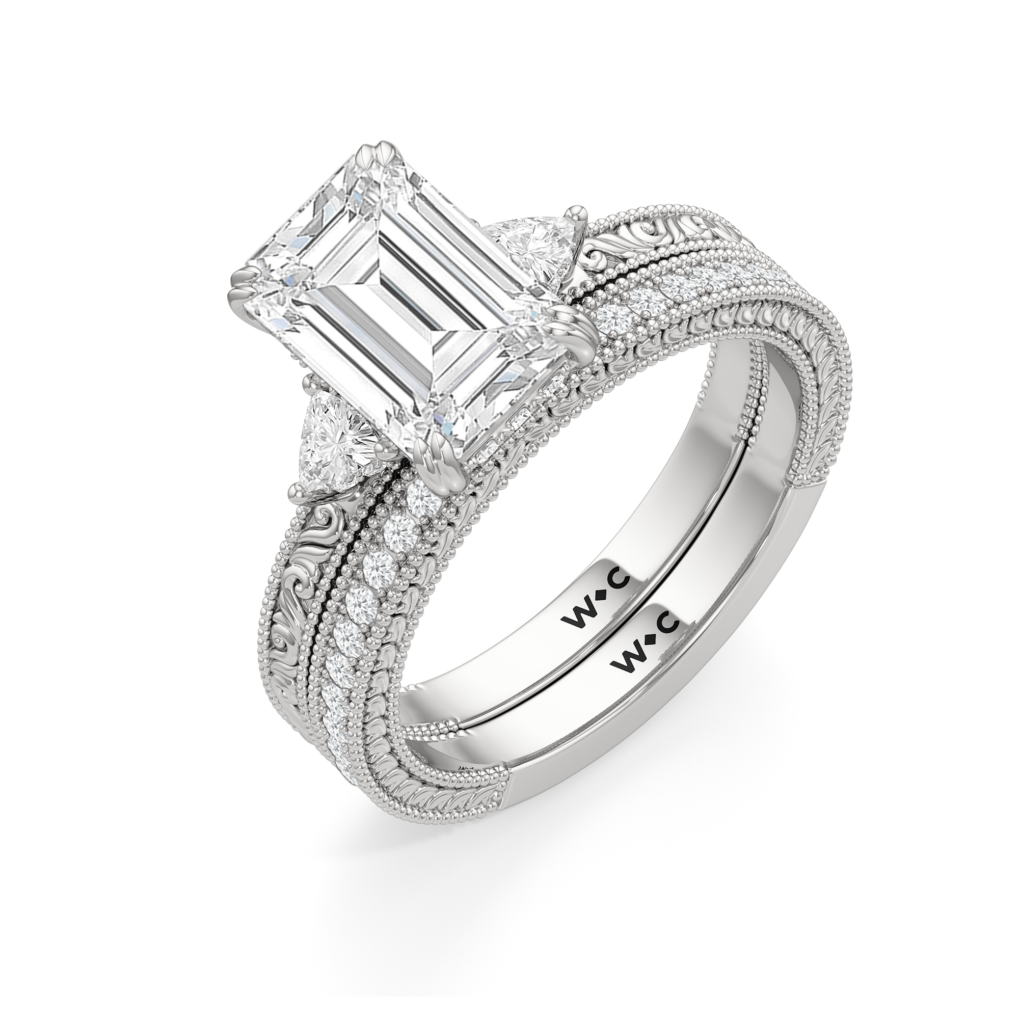 Rooted in Shakespearean lore, Ophelia glows quietly with sentiment. This extraordinary three-stone ring features trilliant-cut diamond side stones and intricate engraving along the band. The center stone's double prong setting with hidden halo draws inspiration from antique heirlooms, yet its crisp execution speaks to modern craftsmanship. Ophelia is not just a ring. It is a statement piece of both scale and sophistication, romance and melancholy.