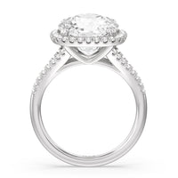 Designed to keep aesthetics to a minimum, this ring's beauty highlights its clean lines, refined profile, and bright shine. Its cathedral shank has its splitting shoulders traced with petite round diamonds. They lead to an imposing central diamond with a classic halo of more round diamonds.