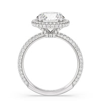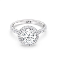 This ring's design brings boldness to a classic solitaire. It features a bigger center diamond framed beautifully by a halo of smaller diamonds and secured by diamond-encrusted prongs. The base of the center stone is also detailed with a hidden halo, complementing the brilliance of the pavé-set round diamonds that run almost all the way around the band.