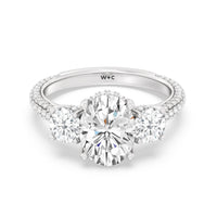 Dazzle her with the enchanting refinement of this three stone engagement ring. This stunner features a gorgeous Round-cut diamond center and side stone mounted on a four-prong basket with a glittering hidden halo. The cathedral shank's arching shoulders are traced with a triple row of diamonds, gracefully running more than halfway around the band.