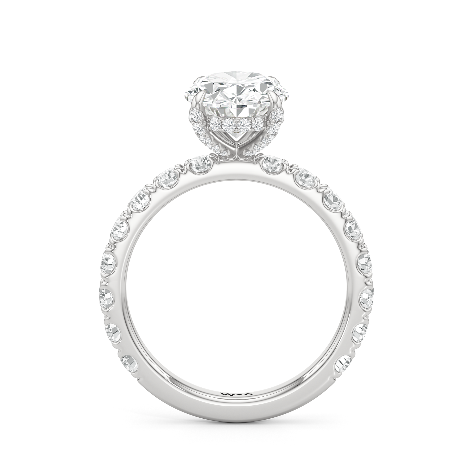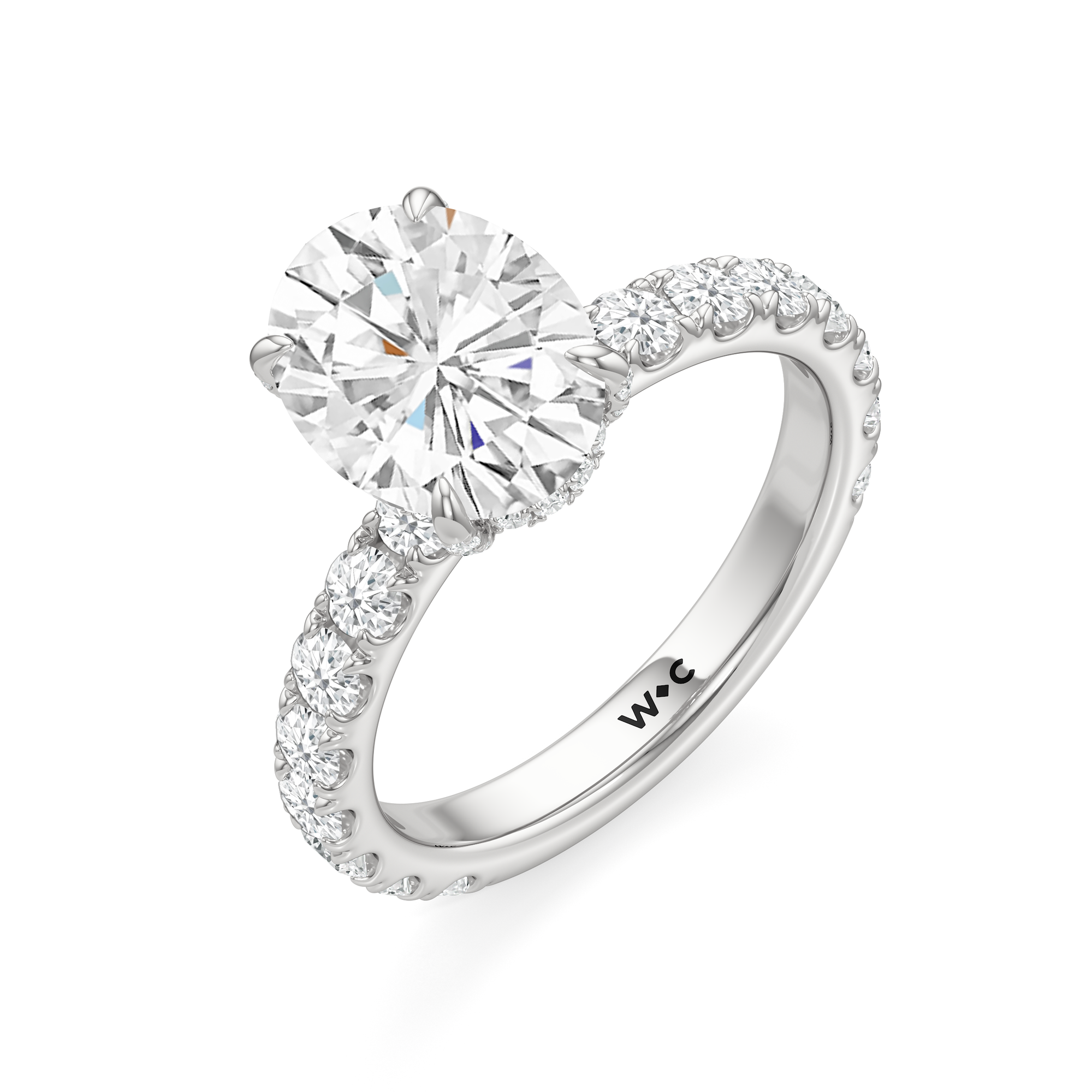 Élan features a fully studded silhouette, where every detail carries an air elegance. Its straight shank echoes grace in structure, while a hidden halo adds a whisper of brilliance beneath the bold center stone. The main gem is held in a classic studded four-claw prong setting, raised with precision to display its beauty in full view.