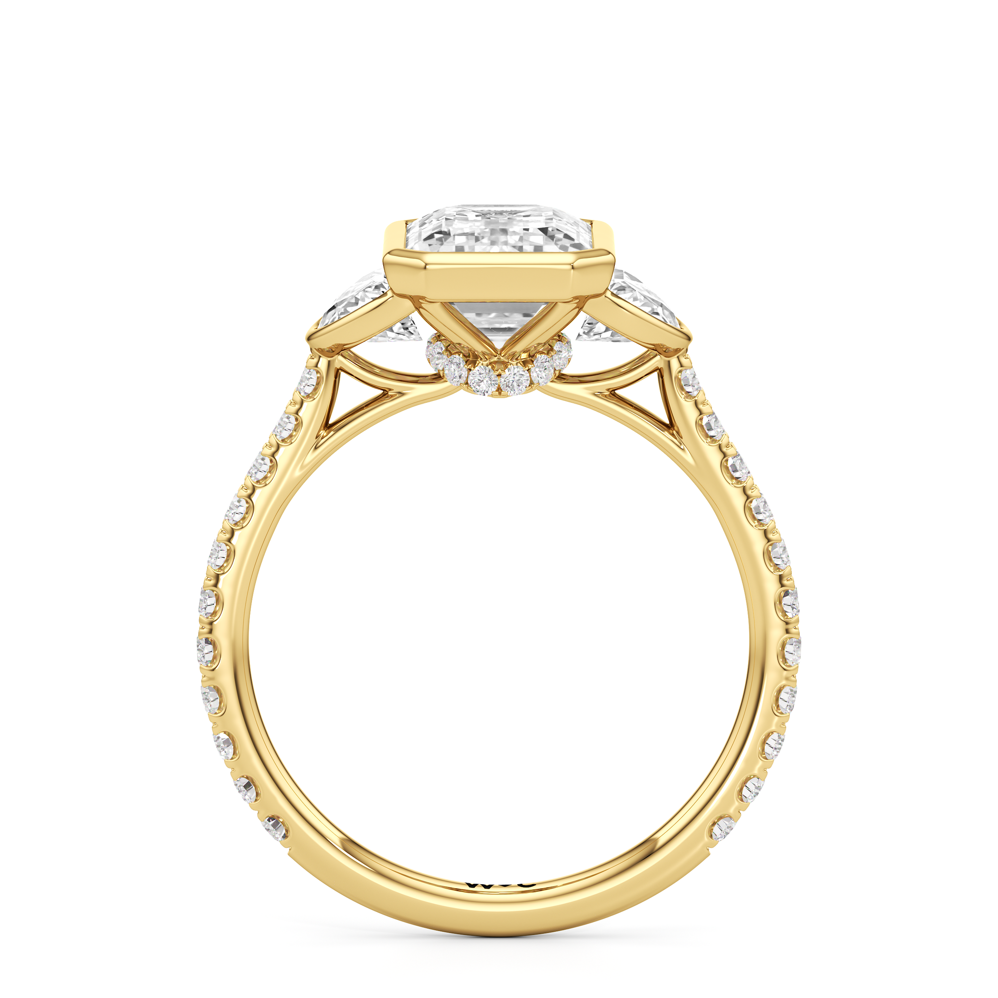 A ring with a distinct character. It bears two half-moon diamond side stones, each sitting on the center diamond's left and right sides. At the base of the central stone is a hidden diamond halo with decorative arms that extend to the side stones. The band's sloping shoulders are also lined with petite round diamonds for a continuous shine. Each of the three stones that form the centerpiece is mounted on a bezel setting, which provides optimum stability, making this trilogy ring perfect for someone who leads an active lifestyle.