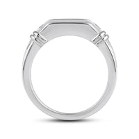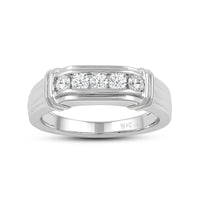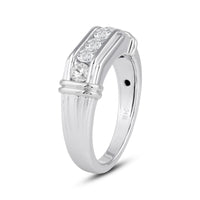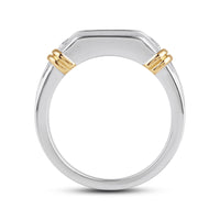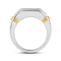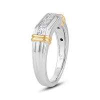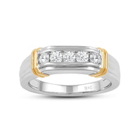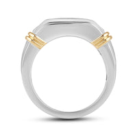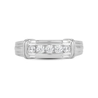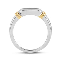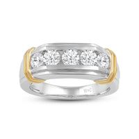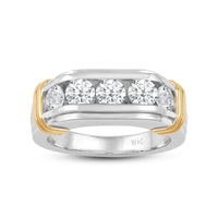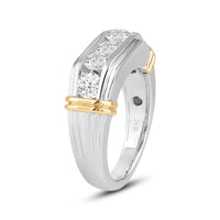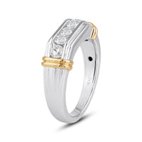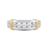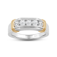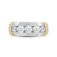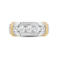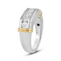 This ring delivers a bold finger presence with its understated yet elevated style. The 14K white gold band features five round channel-set diamonds plus a ridged border detail across its broad and angular center. The sparkling centerpiece is flanked by shiny yellow-gold collars that lend color and interest. To give the ring more shape, the band slightly tapers down in width as it moves away from the centerpiece.