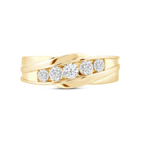 Here is a dashing diamond band perfect for the man who isn't afraid to break the mold and skew tradition a little. The ring features a wavy center with an inset of five sparkling diamonds. The shank is finished with a polished shine. Get this as a symbol of commitment or to show the world that you've found love.