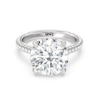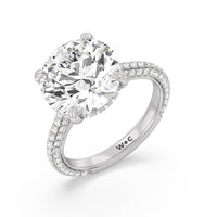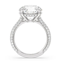 Dazzle her with the enchanting refinement of this luxury diamond engagement ring. This design showcases a center diamond securely mounted in a 4-prong double claw basket with a glittering hidden halo, ensuring brilliance from every angle. The cathedral shank's arching shoulders are adorned with a triple row of diamonds, elegantly cascading three-fourths of the way around the band. A dome pavé shank enhances the ring's radiance, offering a balance of grandeur and quiet luxury. This hidden halo engagement ring defines sophistication is finished with claw prongs for a refined touch.
