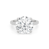 The Cassatt Pave Engagement Ring promises limitless sparkle. Pavé-set diamonds trace the shank, with the radiant and raised shoulders drawing the eye upward towards the center stone. The central gem's visibility and brilliance are enhanced by the drape hidden halo, featuring four claw prongs that captures light from every angle.