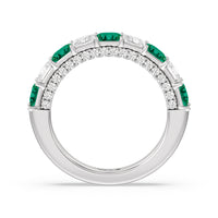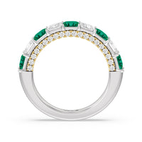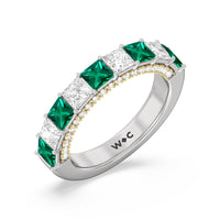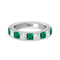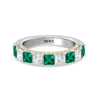 A standout sparkler. This half-eternity ring that's perfect as an anniversary ring epitomizes glowing beauty. Half of the band is traced with created Emerald princess-cut on a prong setting. Underneath the princess created Emerald is an arch of petite round diamonds set on prongs in a different metal tone. The two-toned look and the continuous sparkle give this piece a fashion-forward style plus lots of personality.