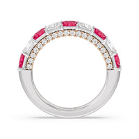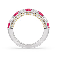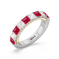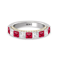A standout sparkler. This half-eternity ring that's perfect as an anniversary ring epitomizes glowing beauty. Half of the band is traced with created Ruby princess-cut on a prong setting. Underneath the princess created Ruby is an arch of petite round diamonds set on prongs in a different metal tone. The two-toned look and the continuous sparkle give this piece a fashion-forward style plus lots of personality.