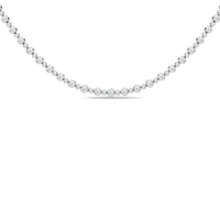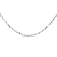 This tennis necklace makes a statement with its modern silhouette. It features a single row of diamonds in alternating big and small sizes. The pattern play further gives interest to the never-ending sparkle of this piece.