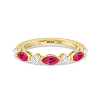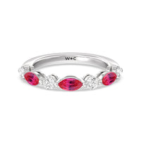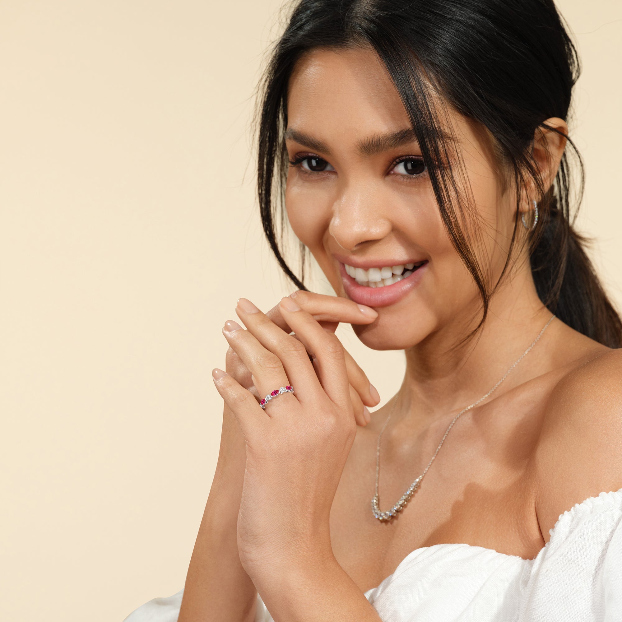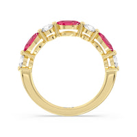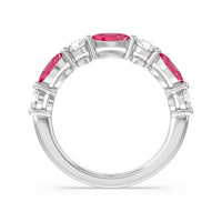 Recognize her love for all things sweet with this diamond anniversary ring of heavenly beauty. Half of the band is gracefully dressed with an alternating pattern of round-cut and oval created Ruby. The slim bottom shank subtly tapers into a pinched shape as it approaches the sparkling arch of diamonds.