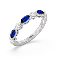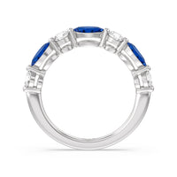 Recognize her love for all things sweet with this diamond anniversary ring of heavenly beauty. Half of the band is gracefully dressed with an alternating pattern of round-cut and oval created sapphire. The slim bottom shank subtly tapers into a pinched shape as it approaches the sparkling arch of diamonds.