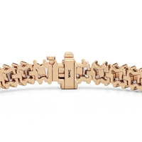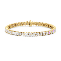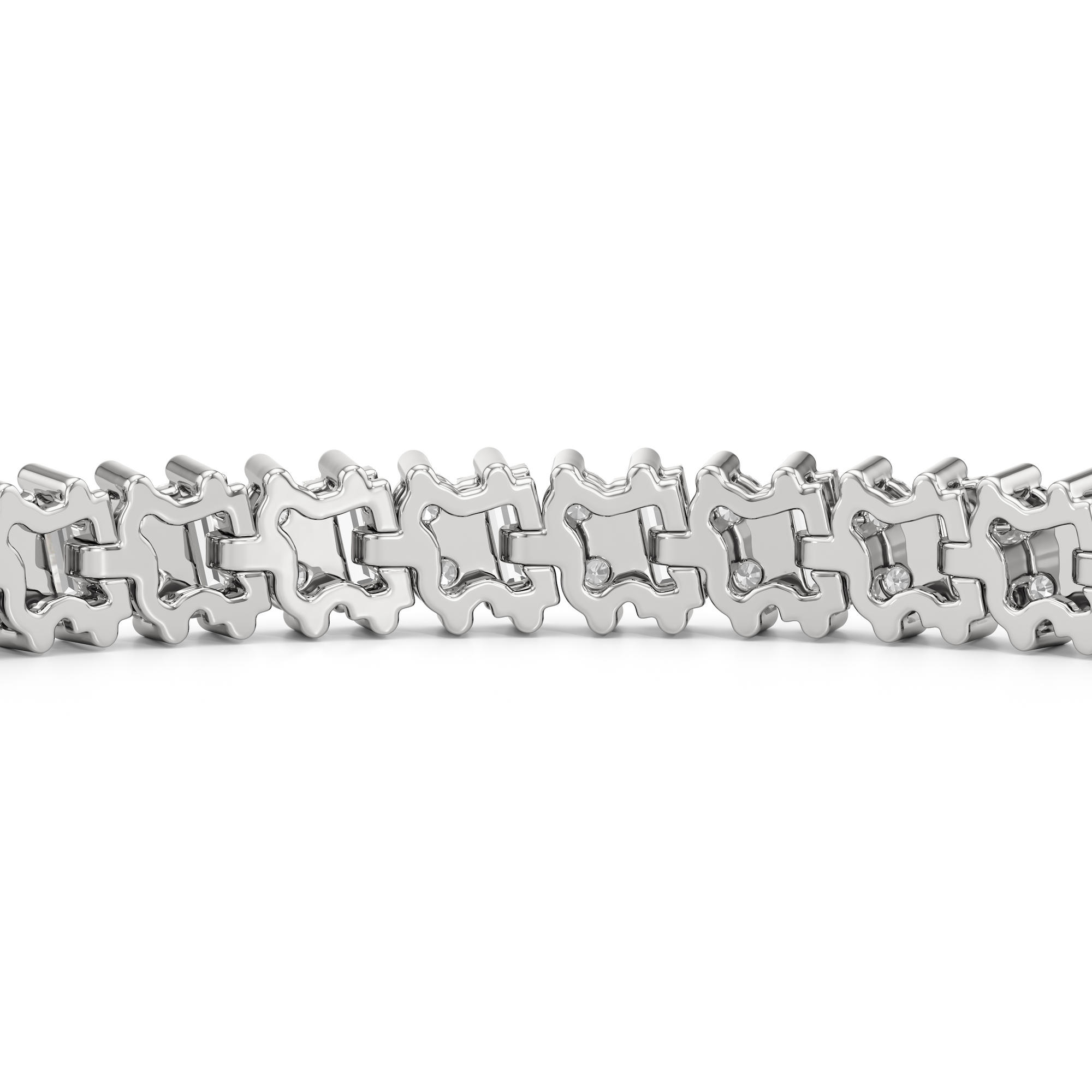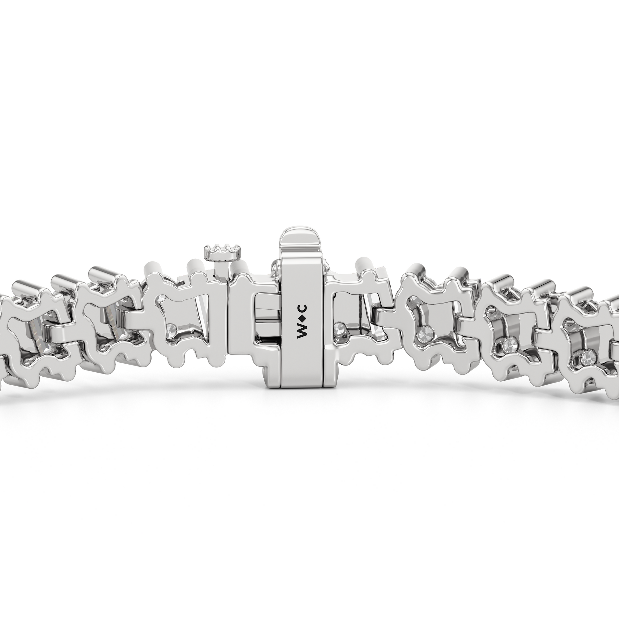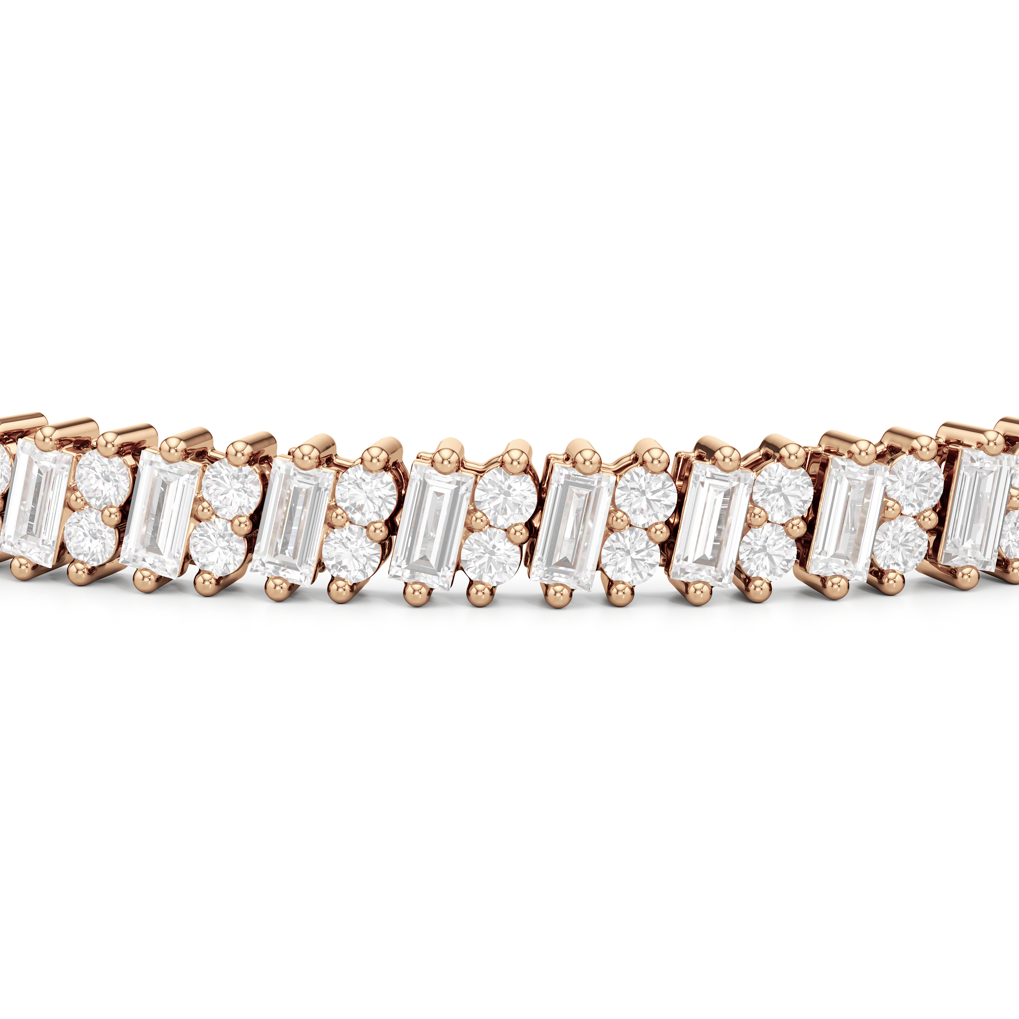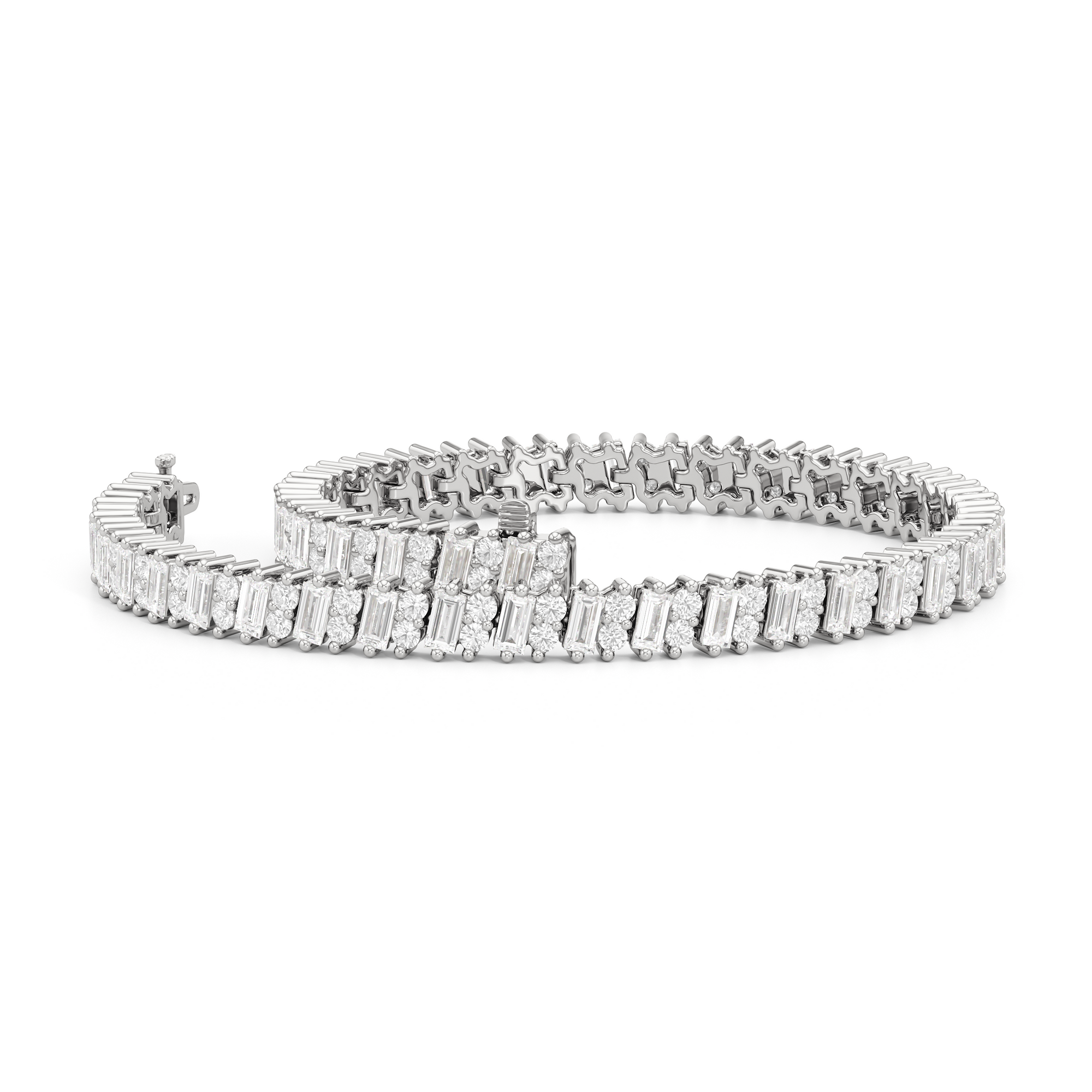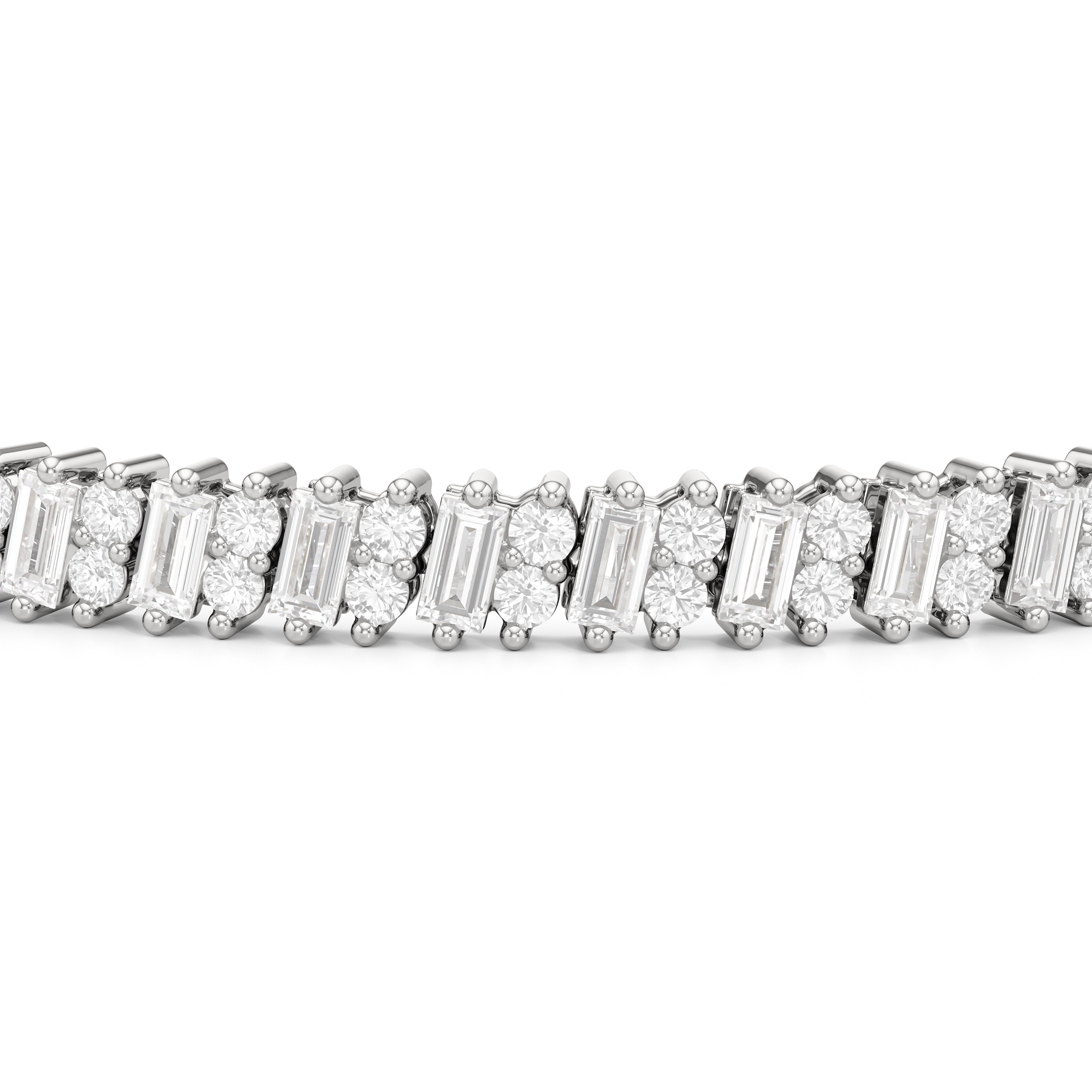 A playful and geometric variation of the classic tennis bracelet. An alternating pattern of baguette diamonds and duos of round diamonds, set in a slanted layout, go all the way around this stunning piece.