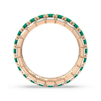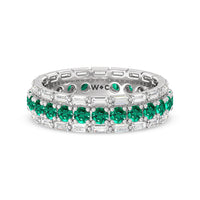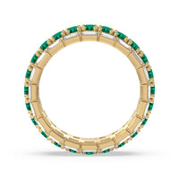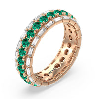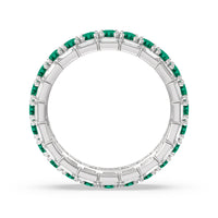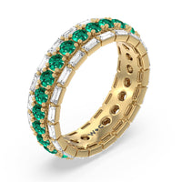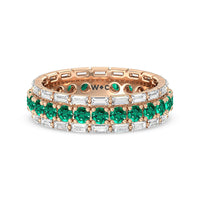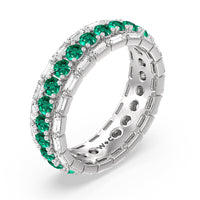 Let the vivid sparkle of this eternity ring mark a milestone in your love story. This eternity band features a continuous row of round created Emeralds encircling the central portion of the shank. Acting as borders are two rows of baguette diamonds lining the edges of the band. Impressive and expressive in sparkle, this ring pictures perfectly the love you have for your special someone.