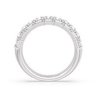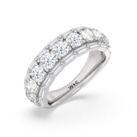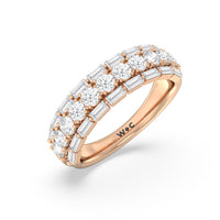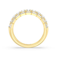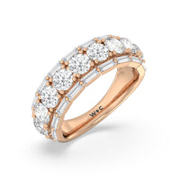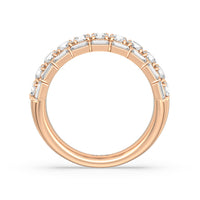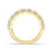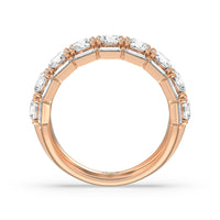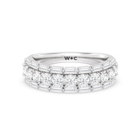 A classic half-eternity ring with a deep and diverse brilliance. This anniversary ring features a central arch of round diamonds sandwiched between two rows of baguette-cut diamonds. The edges of the shank are slightly ridged to follow the silhouette of the step-cut gems.