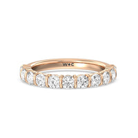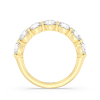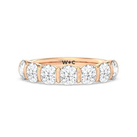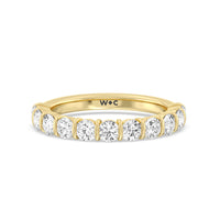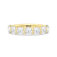 A sophisticated diamond ring designed to look polished and structured yet feminine and chic This anniversary ring features a total of eleven round diamonds, nine of which are of the same size tracing half of the band. Two slightly smaller diamonds punctuate each end of the glittering diamond arch.