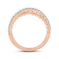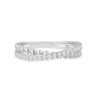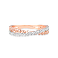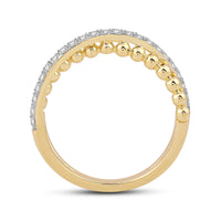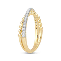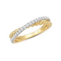 Here is one statement ring a minimalist will love. This lovely piece features a cross-over split shank with a yellow gold beaded band intersecting with a diamond-pavd band. Brilliantly designed, this ring is sure to draw attention. The bottom of the shank is solid, smooth, and rounded for a comfortable fit.