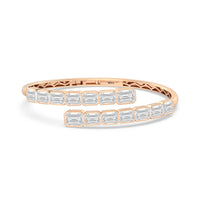 A beautiful add-on to literally any high-fashion outfit. This diamond bangle bracelet mixes and matches well with different fashion styles. It features a bypass design with bezel-set emerald-cut diamonds that offer a subtle yet still striking sparkle.