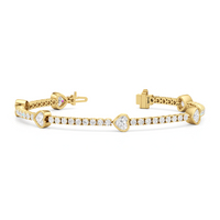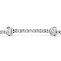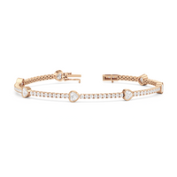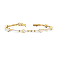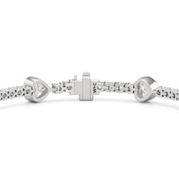 A picture of romance and indulgence. This diamond tennis bracelet is comprised of round diamonds, each on claw prongs, forming a straight but flexible line. Several heart-shaped diamonds, each secured by a bezel, sit at evenly spaced stations, breaking the line with its impressive brilliance.