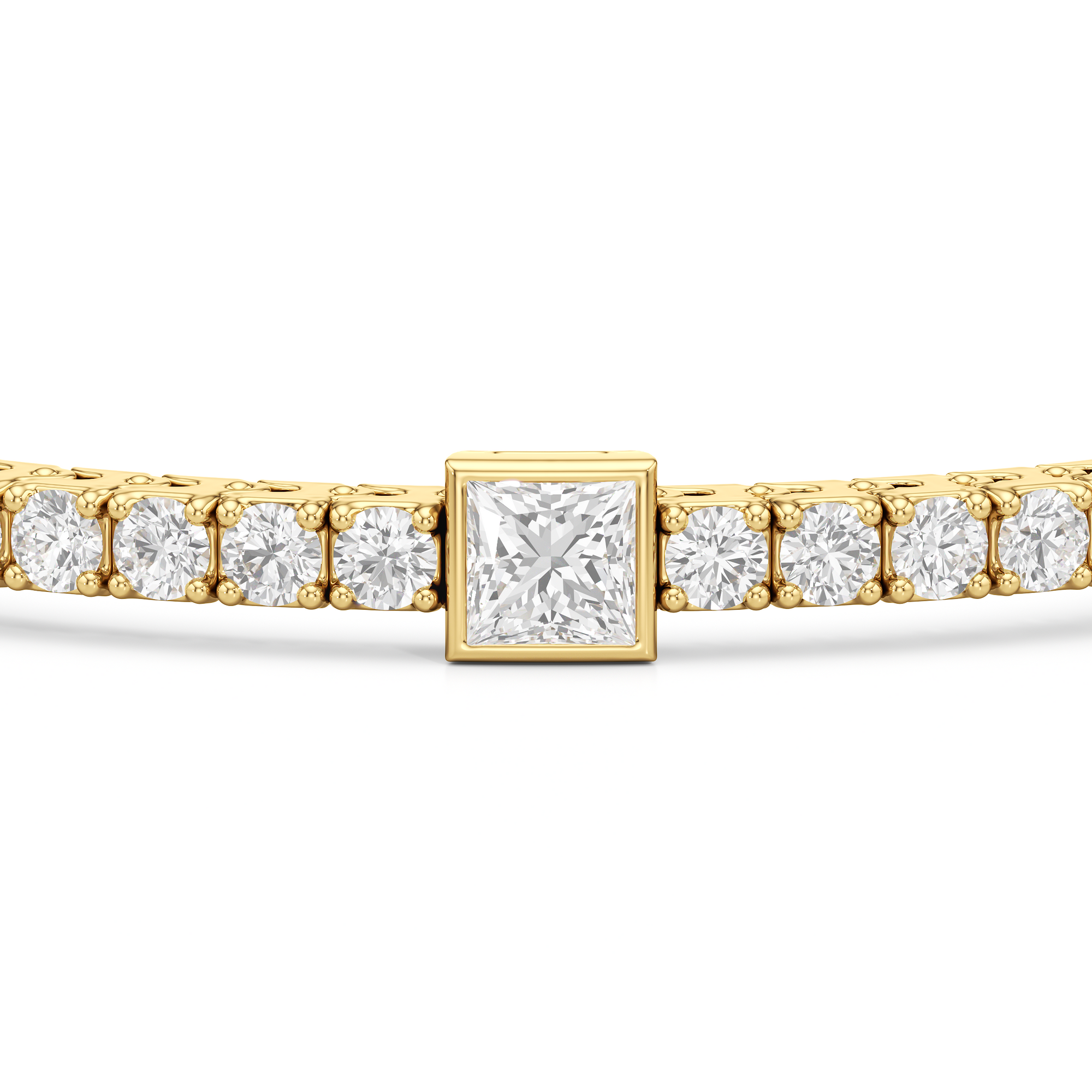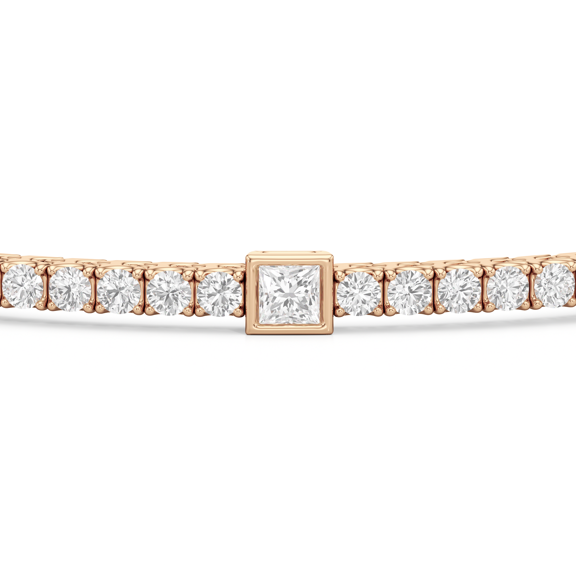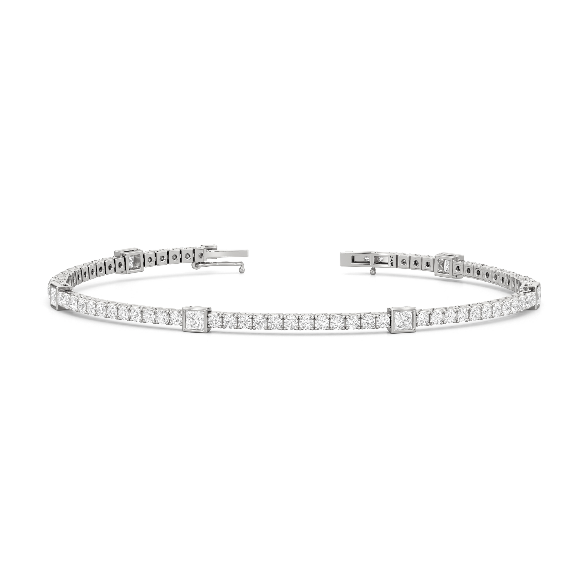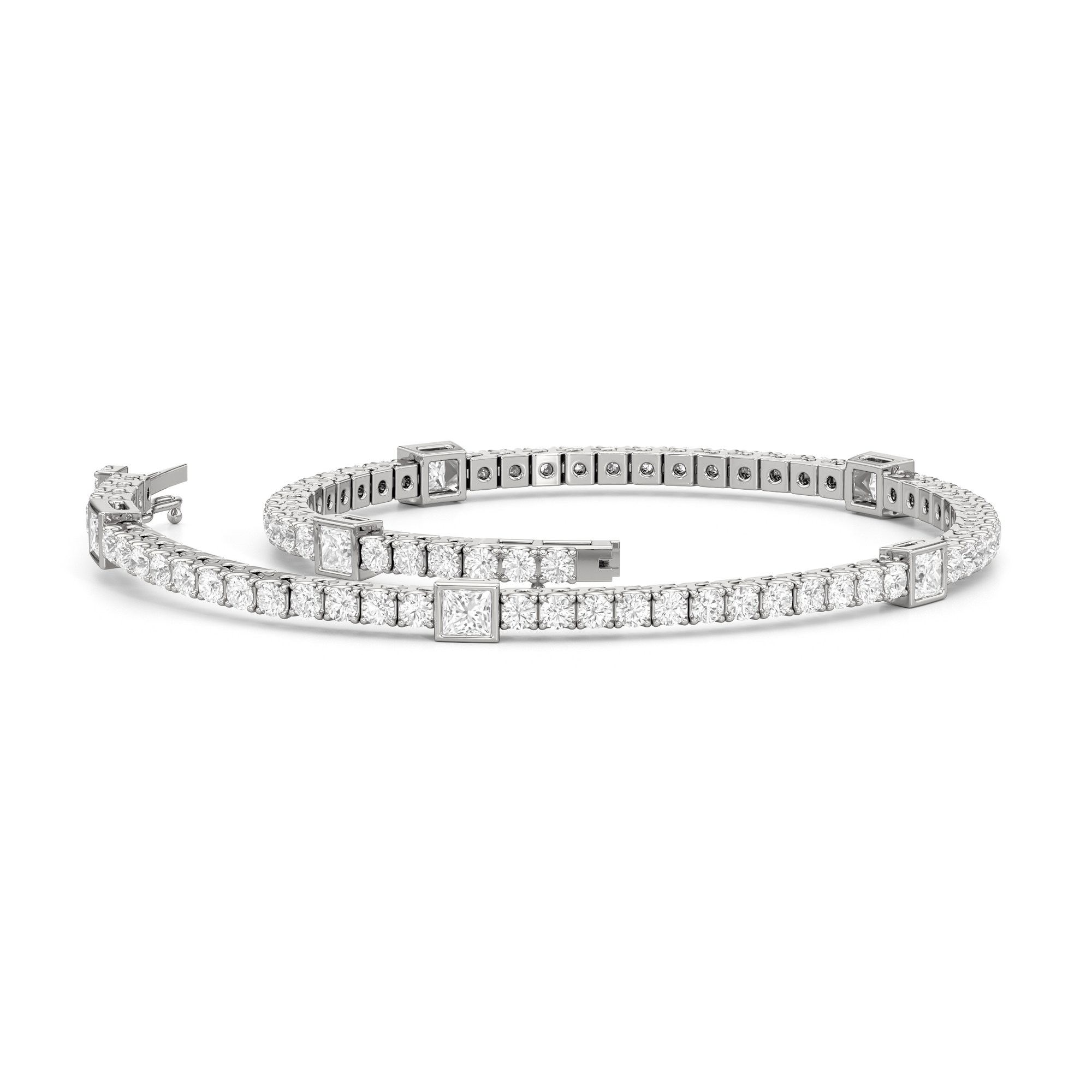 A unique choice. This tennis bracelet's singular strand of round diamonds is interrupted by princess-cut diamonds, each on a bezel setting. With its distinctive brilliance, this diamond bracelet ensures your jewelry stack is better than ever.
